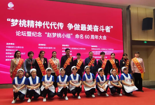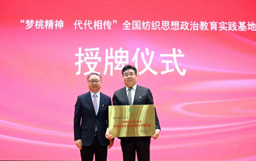一束束鮮花凝聚了一代代“夢桃小組”成員的濃濃戰(zhàn)友情、姐妹情,“夢桃精神”將她們的心緊密連接在一起,“趙夢桃小組”成員始終以趙夢桃同志為榜樣,在工作上勇于創(chuàng)新、甘于奉獻(xiàn)、精益求精,爭做新時代的最美奮斗者,把夢桃精神一代一代傳下去。  十位全國勞模代表楊普、毛玉剛、謝秀榮、李承霞、王筆仙、姜玲、劉莎、何東升、黃云娜、范冬云上臺,與趙夢桃小組成員合影留念。  隨后,“趙夢桃小組”全體成員舉起右手莊嚴(yán)宣誓,始終堅守“夢桃精神”不掉色,牢記習(xí)近平總書記對“趙夢桃小組”的勉勵,繼續(xù)以趙夢桃同志為榜樣,在工作上勇于創(chuàng)新、甘于奉獻(xiàn)、精益求精,爭做新時代的最美奮斗者,把夢桃精神一代一代傳下去。  為了在新時代更好研究、傳承和弘揚(yáng)好夢桃精神,中國紡織工業(yè)聯(lián)合會決定在咸陽紡織集團(tuán)有限公司建立“夢桃精神代代相傳”全國紡織思想政治教育實踐基地。中國紡聯(lián)希望咸陽紡織集團(tuán)在弘揚(yáng)傳承夢桃精神的新征途中,保護(hù)好、研究好、利用好、傳承好“夢桃精神”,進(jìn)一步挖掘夢桃精神文化因素和新時代內(nèi)涵,打造思想和文化建設(shè)新高地。為更好傳承“趙夢桃小組”優(yōu)良傳統(tǒng),弘揚(yáng)新時代勞模精神、勞動精神、工匠精神、創(chuàng)新精神,凝聚全國紡織行業(yè)創(chuàng)新力量,夯實紡織強(qiáng)國根基,助推全國紡織服裝產(chǎn)業(yè)邁向高質(zhì)量發(fā)展。中國紡聯(lián)黨委辦公室主任、中國紡織職工思想政治工作研究會會長邢冠蕾宣讀設(shè)立基地《決定》。