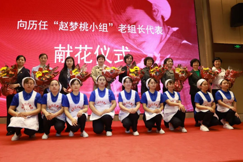 “趙夢桃小組”歷任組長也來到大會現(xiàn)場。為表達(dá)對老組長們的敬意與愛戴之情,“趙夢桃小組”現(xiàn)任組長王丹帶領(lǐng)她的姐妹們,精心準(zhǔn)備了鮮花獻(xiàn)給趙夢桃小組第3任組長王西京、第5任組長王廣玲、第7任組長韓玉梅、第8任組長劉育玲、第9任組長徐保鳳、第10任組長周惠芝、第11任組長劉小萍、第12任組長王曉榮、第13任組長何菲。