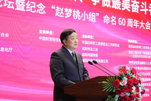 為紀(jì)念“趙夢桃小組”命名 60 周年,進(jìn)一步推動習(xí)近平總書記對“趙夢桃小組”親切勉勵貫徹落實,激勵全國紡織行業(yè)傳承弘揚(yáng)“夢桃精神”,為建設(shè)現(xiàn)代化紡織強(qiáng)國再立新功,4月25日,“夢桃精神代代傳,爭做最美奮斗者”紀(jì)念“趙夢桃小組”命名60周年大會在陜西省咸陽市舉行。會議由中國紡織工業(yè)聯(lián)合會、陜西省總工會、陜西省工業(yè)和信息化廳、中共咸陽市委員會、咸陽市人民政府主辦;中國財貿(mào)輕紡煙草工會支持;中國紡織職工思想政治工作研究會、咸陽市總工會、咸陽市國資委、咸陽紡織集團(tuán)有限公司承辦;陜西省紡織職工思想政治工作研究會 、西安工程大學(xué)“夢桃精神 代代相傳”——全國紡織思想政治教育基地、陜西省財貿(mào)金融輕工工會、西安紡織集團(tuán)有限責(zé)任公司、際華三五一三實業(yè)有限公司、陜西雅蘭紡織集團(tuán)有限公司協(xié)辦。 中國紡織工業(yè)聯(lián)合會會長孫瑞哲、原會長王天凱、黨委副書記陳偉康、原副會長楊紀(jì)朝,中國紡聯(lián)副秘書長、外事辦公室主任袁紅萍,中國紡聯(lián)黨委辦公室主任、中國紡織職工思想政治工作研究會會長邢冠蕾,中國財貿(mào)輕紡煙草工會二級巡視員呂杰,陜西省人民政府辦公廳副主任徐剛,陜西省總工會黨組副書記、常務(wù)副主席王軍,陜西省工業(yè)和信息化廳黨組成員、陜西經(jīng)濟(jì)聯(lián)合會會長楊悅,中共咸陽市委書記夏曉中,中共咸陽市委副書記、市人民政府市長冷勁松,咸陽市人大常委會副主任、市總工會主席田一泓,陜西省人民政府國有資產(chǎn)管理委員會黨委副書記、一級巡視員郁偉,西安工程大學(xué)黨委副書記趙小峰,陜西省思想政治工作研究會秘書長張虎鳴,陜西省財貿(mào)金融輕工工會主席趙亮,陜西省紡織職工思想政治工作研究會會長侯代會,以及來自中國紡聯(lián)、陜西省有關(guān)部門、咸陽市委、咸陽市人民政府有關(guān)負(fù)責(zé)同志,“趙夢桃小組”老組長代表,各省市紡織協(xié)會、排頭企業(yè)、產(chǎn)業(yè)集群代表,紡織高校及陜西省紡織服裝行業(yè)、協(xié)會代表,全國勞模、全國紡織優(yōu)秀班組長代表,咸陽紡織集團(tuán)干部職工代表等200余人與會。