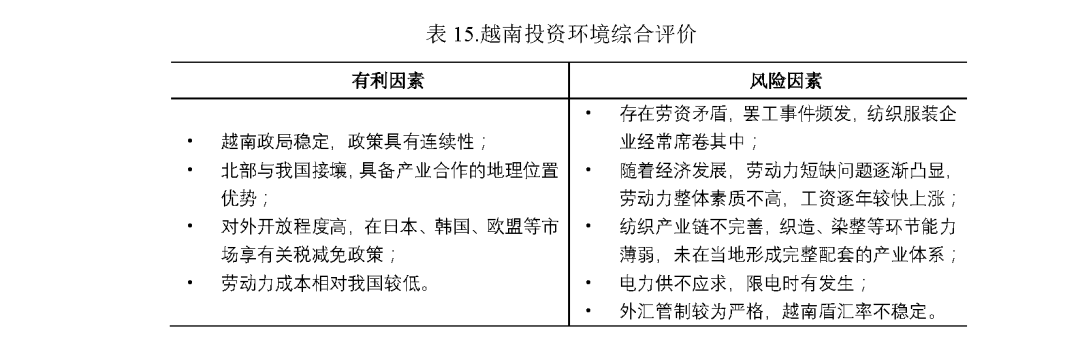 (3)近年來,越南勞動(dòng)力成本上漲較快,罷工事件時(shí)有發(fā)生,環(huán)保要求較高,我國紡織企業(yè)應(yīng)全面做好成本核算,充分考慮勞資糾紛、環(huán)保、限電等風(fēng)險(xiǎn)因素。