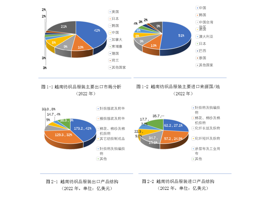 目前,越南是世界第二大紡織品服裝出口國(僅次于中國),第三大服裝出口國(僅次于中國、孟加拉),出口產(chǎn)品以服裝為主,進(jìn)口以纖維原料、紗線及面料為主。根據(jù)聯(lián)合國數(shù)據(jù),2022年,越南紡織品服裝(海關(guān)HS編碼50~63章紡織原料、紡織品及服裝)出口額為409.4億美元,主要出口市場(chǎng)是美國、日本、韓國、中國,其中對(duì)美國出口額占出口總額的42%。服裝是主要出口產(chǎn)品,占紡織品服裝出口總額的74%,其中針織服裝占比高達(dá)42%。同期,越南紡織品服裝進(jìn)口額為229.9億美元,中國是越南第一大進(jìn)口來源地,約占進(jìn)口總額的51%,其次為韓國、中國臺(tái)灣地區(qū)、澳大利亞等。主要進(jìn)口產(chǎn)品為針織物及鉤編織物(占比27.1%),棉花、棉紗及棉機(jī)織物(占比24.9%),化纖長絲及織物(占比15.1%),化纖短纖及織物(占比9.7%)。