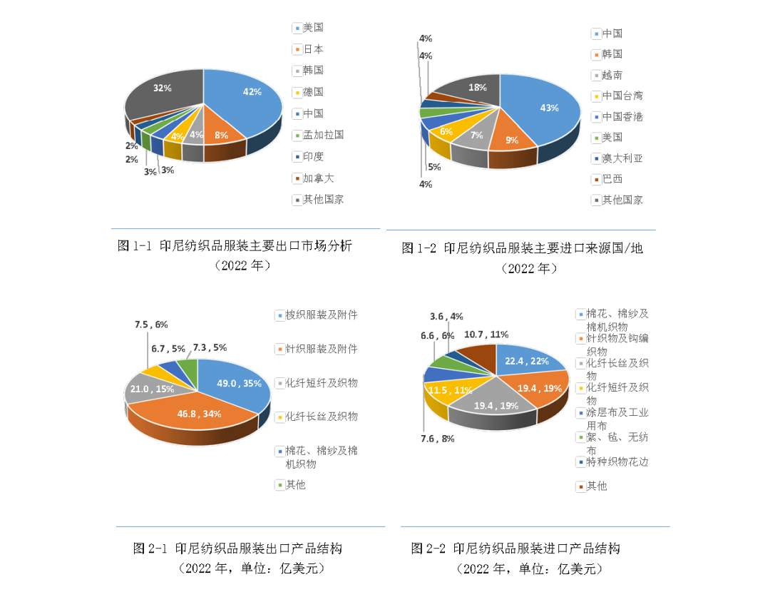 印度尼西亞國家統計局數據顯示,2022年印尼紡織品服裝出口總額138.3億美元,其中,紡織品出口42.5億美元,服裝出口95.8億美元,主要出口美國、日本、韓國、德國、中國、孟加拉國、印度等國家,其中美國是最主要的出口目的國,約占全年紡織服裝出口總額的41.6%。同期印尼紡織品服裝進口額為101.3億美元,中國是印尼第一大紡織品服裝進口來源地,占印尼紡織品服裝進口總額的43.2%,其次是韓國、越南、中國臺灣、中國香港、美國。印尼主要出口產品是服裝(占比69%)、化纖短纖(占比15%)、化纖長絲(占比6%)等;主要進口產品為棉花、棉紗及棉機織物(占比22%),針織物(占比19%),化纖長絲(占比19%)及化纖短纖(占比11%)等。