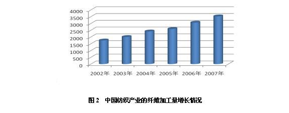 2007年全球纖維消費總量約7 840萬t。中國紡織產(chǎn)業(yè)的纖維加工量3 530萬t,占全球纖維消費45%。2002年以來,中國纖維加工量以15%的速度遞增(圖2)。毫無疑問,中國是世界紡織服裝供應鏈中最重要的制造中心。