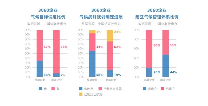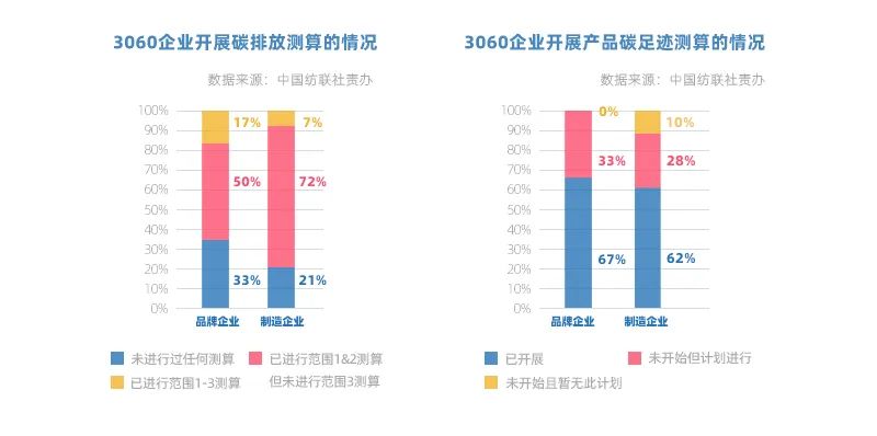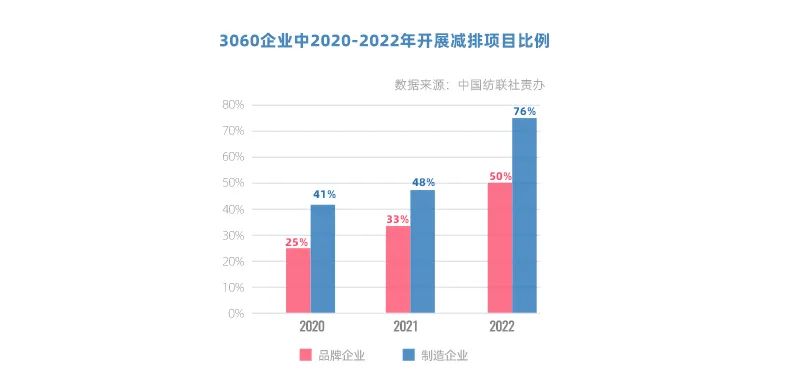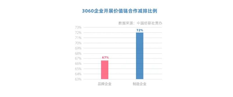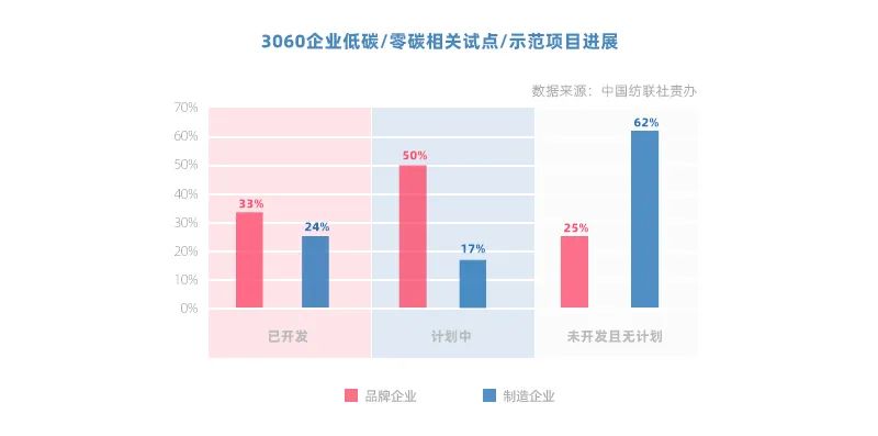 隨著國家推動并建立綠色低碳相關工廠與產品等評價方法,紡織企業積極響應,錨定產業轉型新機遇,3060企業已有27%完成開發低碳/零碳相關試點/示范項目。