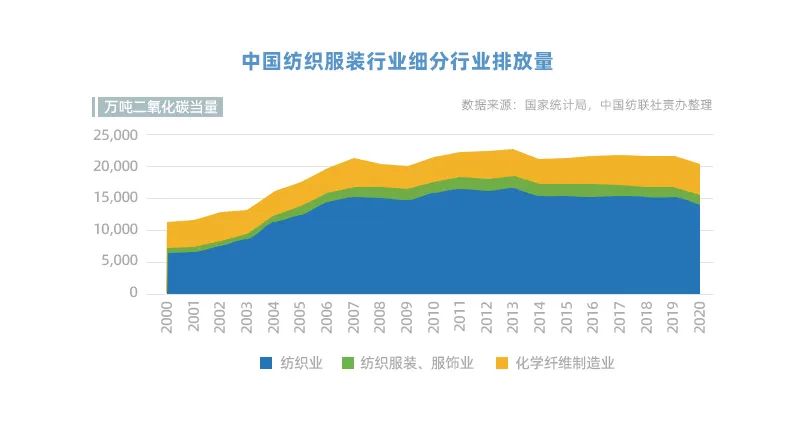 中國紡織服裝行業溫室氣體排放自2000年起隨著行業快速發展逐步上升,而后進入平穩期。2014年-2020年溫室氣體排放年均增速均低于0.5%。根據行業能源消費數據計算,2020年整個行業碳排放總量約為2.09億噸。從排放來源看,中國紡織服裝行業排放主要來自上游的材料制造加工端(包括紡織業和化學纖維制造業),紡織服裝、服飾業占比低于10%。