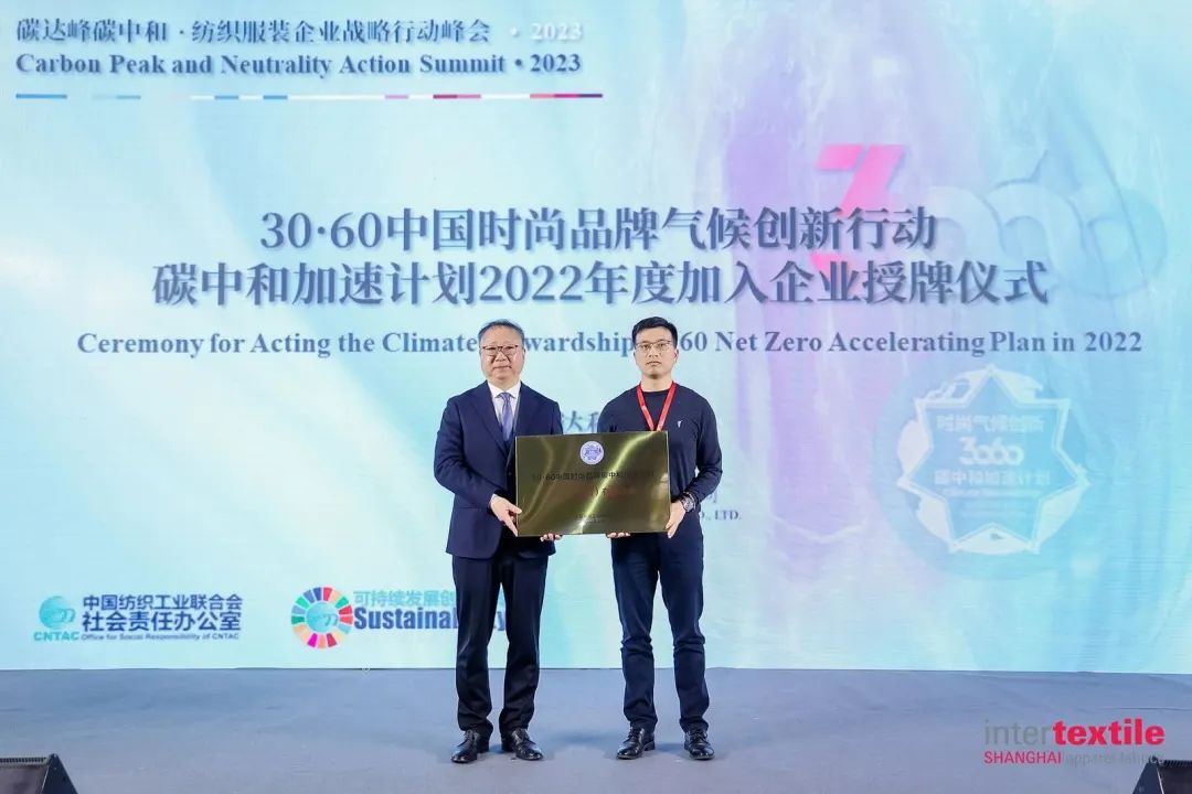 會上舉行了30·60中國時尚品牌氣候創新行動碳中和加速計劃2022年度加入企業授牌儀式。孫瑞哲為鄂爾多斯、卡賓服飾、達利中國、廣東兆天的企業代表頒發牌匾。