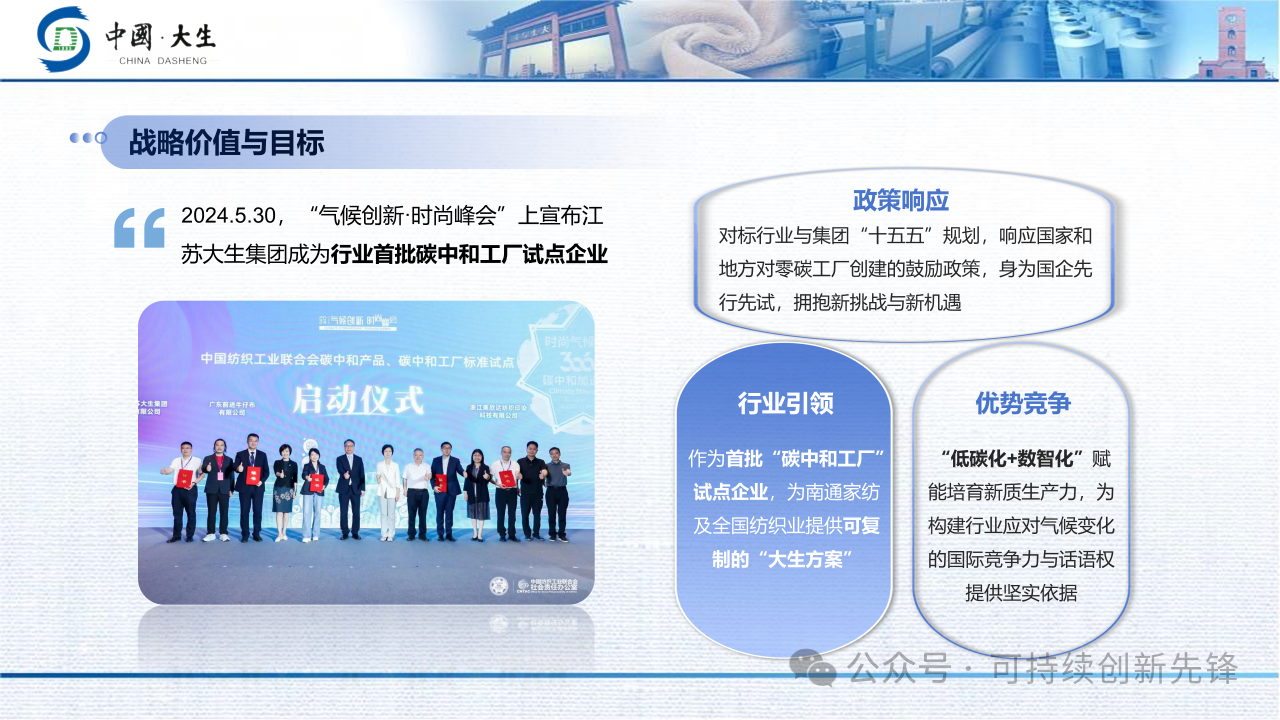 大生紗廠在江蘇南通舉行 “碳中和智慧紡紗工廠” 投產儀式,同步發布《碳中和工廠實施計劃》。